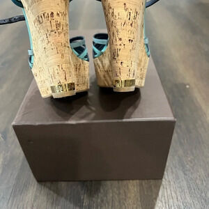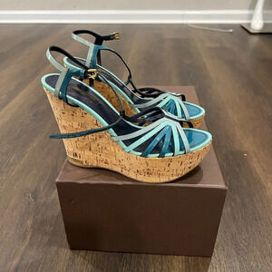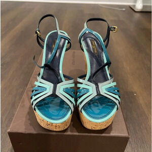 Blue-green, teal and navy patent leather Louis Vuitton platform. wedges with cork wedge heels and buckle closure at ankles. Includes box and dust bag. Item#: LOU249073