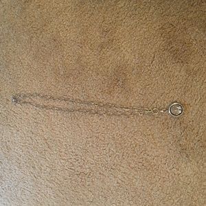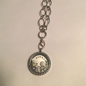 Authentic Origami Owl long 18" necklace chain with circle charm holder (diamond studded). Silver back plate inside monogrammed with "always". Charms include: a volleyball, the letter A, family w a heart, a margarita glass, love charm, purple (June) birthstone heart, and a cross.