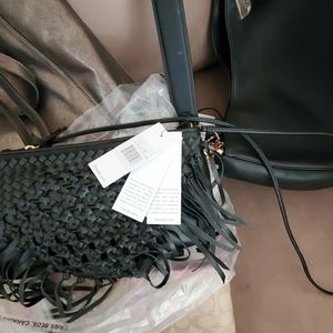 New black woven leather.The Filmore 3 in 1 Clutch boasts easy convertibility and a chic macrame exterior. Wear as a wristlet, clutch or crossbody depending on where you're off to next! It's the perfect shape for tagging along on date nights or events..