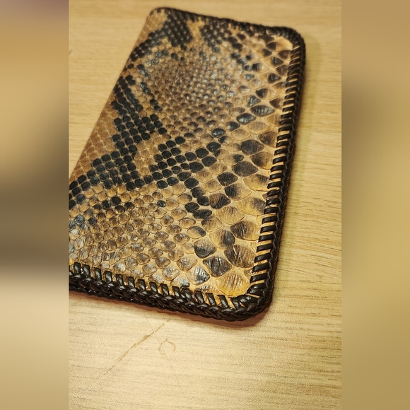 Beautiful wallet made out of real python skin. It has a genuine leather inside and the stitch is also leather. Very rare and hard to come by. Very well made. this was made to last a lifetime! For a man or woman.