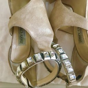 Authentic suede shimmer Nude Jimmy choo heels size 37.5 fit to size used once for a wedding heel is about 4" gently used condition. Beautiful Swarovski crystals around your ankles.