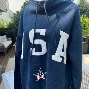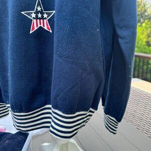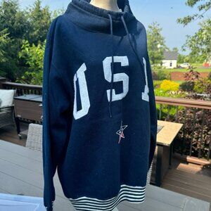 Authentic vintage “USA” hoodie from the Sporting Club label, likely late 90s to early 2000s era. Features bold varsity-style lettering across the chest, patriotic star detail, striped cuffs/hem, and an American flag patch on the sleeve. Super soft and cozy with a slouchy relaxed fit—perfect for Fourth of July, Memorial Day, or Labor Day looks. Minor signs of wear (see photos) but overall great condition for its age. Tag size medium, fits true to size.