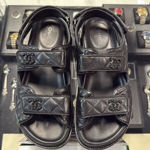 Authentic! BLACK Chanel Quilted Leather Dad Sandals box & dust covers SIZE 38C