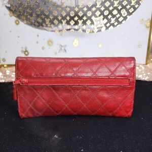 Condition - This vintage Wallet is in overall great condition. The wallet is red with diamond stitching. There is areas on the wallet that are slightly darker however they are hard to see unless really close up. The body of the wallet is great. There is minor wear on the corners and slight darkening from use. The snap works fine. The inside opens to several compartments. There is a front slip pocket, another pocket that has a flap snap to secure items and then another larger slip pocket on the other side of the snap. There is also a zipper pocket on the back of the wallet. The inside is clean and free of defects. The wallet also comes with the COA card. You will receive the wallet, the COA card, Unbranded Conversion Chain and a Chanel Compact Double Sided Mirror.