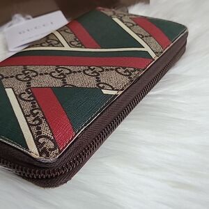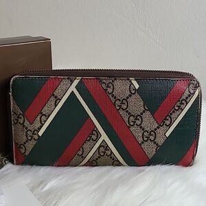 💯Authentic Gucci Round Zip Long Wallet GG Chevron Beige Green Red🍀