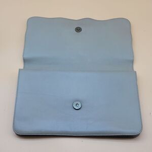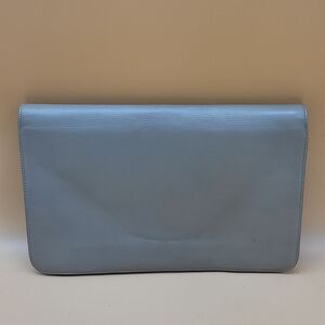 The outer leather showed sign of used with stains, scratches, marks & spots. The ribbon trim has some stains & darkened. The hardwares are tarnished. Inside clutch has some stains, spots, wrinkles, there is a small compament with full zipper. Please review the last photo for serial numbers. It made in Italy. Dimensions ( approx) 11, 7, & 1.5". Color: brown ( not baby blue). No trade.