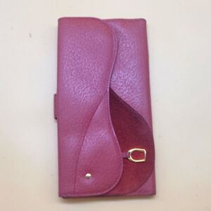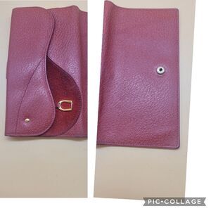 The outer leather has some scratches, spots, the suede leather part has some stains & discoloration. Inside wallet has 6 card slots, 4 billfold, there is another pocket on the back ( stains inside, 9th photo). Please review the last photo for serial numbers, & 10th photo for the actual wallet 's color. It made in Italy. Dimensions ( approx) 6.75, 3.5, .5". No trade.