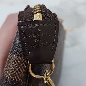 Authentic Louis Vuitton Damier Ebene Mini Pochette. Canvas in excellent condition. A few stains on the inside- see pictures. Slight discoloration on zipper tab. Overall great condition. Comes with dustbag.