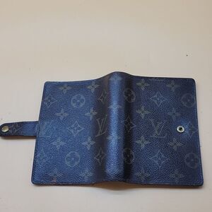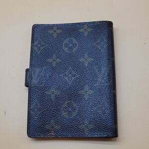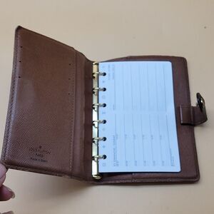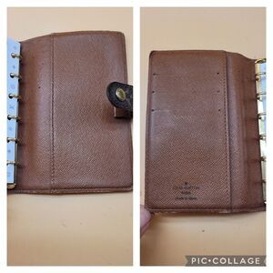 The outer leather showed sign of used with corners are little worn (7th photo). Inside has some scratches, spots, ring marks, 3 card slots, 2 billfold ( peeled inside, 9th photo). The hardwares have some scratches. Few insert pages are included. Please review the last photo for date code. It made in Spain. Dimensions ( approx) 5.5, 4". No trade.