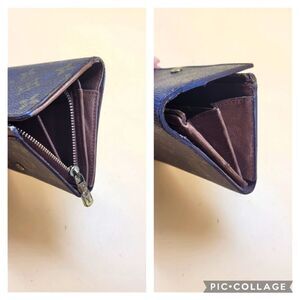 The outer leather has a spot. The hardwares are tarnished. Zipper runs smoothly. Inside wallet showed wearing with scratches, stains, scuffs, a tiny lose stitches (6th photo), 5 billfold, a coin with 2 pockets ( dirt stains, peels, scratches inside pockets). No date code found pre 1980's. It made in France. Dimensions ( approx) 5.5, 3.5, .5". No trade.