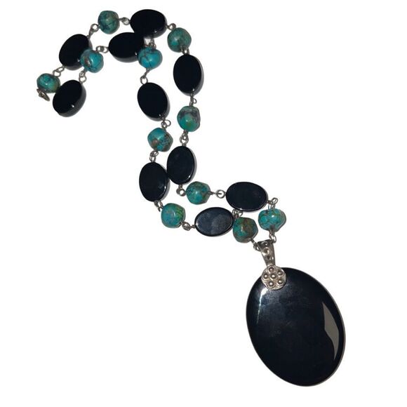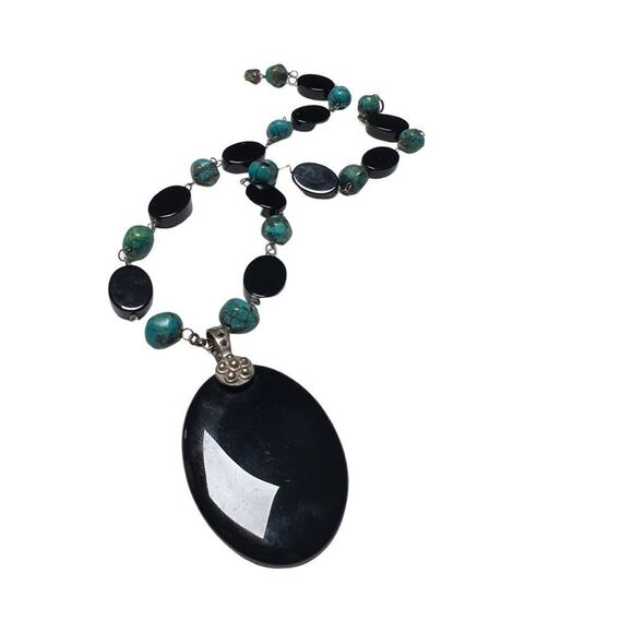 Vintage Lucas Lameth Turquoise and Onyx, sterling silver beads and clasp necklace