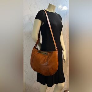 Interior has 2 slip and 1 large zip pockets, lined with brown Suede. Main compartment has Double-Twist Lock Clasp. Next to it along the side is a separate zipper compartments. This particular version with the adjustable shoulder strap is hard to find as most are the Double Handle style.