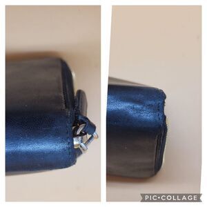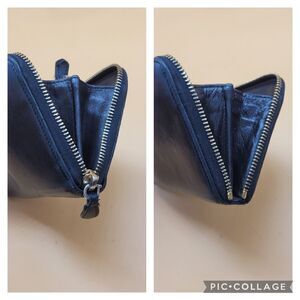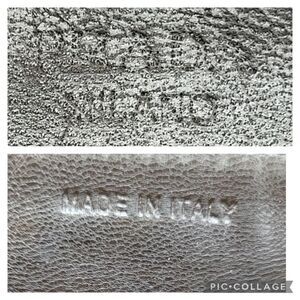 The outer leather showed wearing with scratches, scuffs & stains. The hardwares are faded. Zippers run smoothly. Inside wallet has some scratches, 4 billfold, 8 card slots, coin with full zipper ( dirt stains inside). No serial numbers found. It made in Italy. Dimensions ( approx) 7, 4, .5". Box is included. No trade.