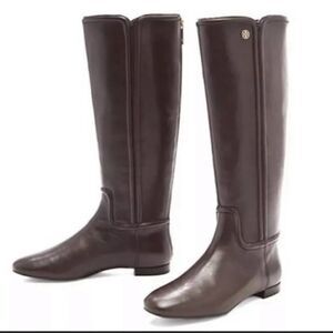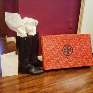 Black leather boots with leather in good condition. Zippers run the full length of the back with gold pull that has the Tory Burch symbol. Also a small (dime size) classy Tory Burch logo symbol at the top on the outer side on both. All flaws shown. The biggest issue being the bottoms. Still completely wearable, but it looks as if they were melted in the middle of the sole. Comes with box and receipt.