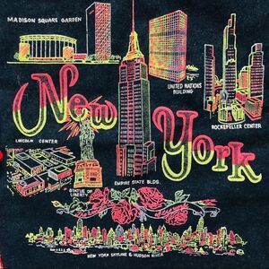 Features famous places from New York such as Madison Square Garden, United Nations Building, Rockefeller Center, Lincoln Center, Empire State Building, Statue of Liberty.