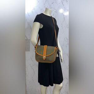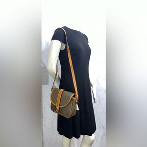 Olive green coated nylon bag with leather trim and horsehair fob. The bag features a pocket on the backside of the purse, a magnetic snap closure, the inside has a zipper pocket and two non-zipper pockets. This bag is new without tags and is in excellent condition."