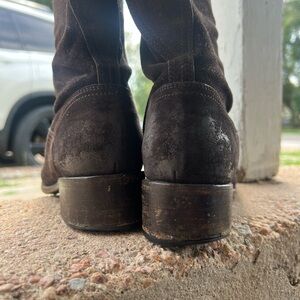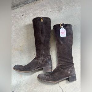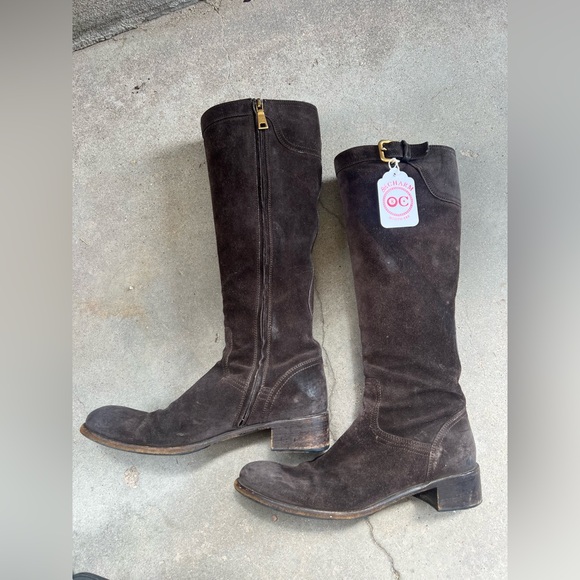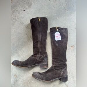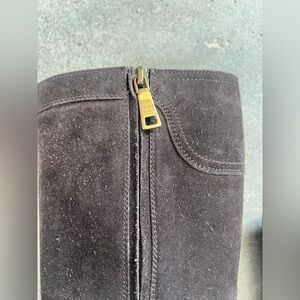 Size 37 (7.0 fit best). Vintage, great condition although signs of wear. Elegant knee-high boots in dark brown suede. Features a sleek side zipper.