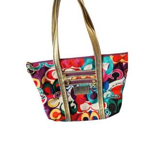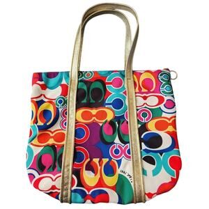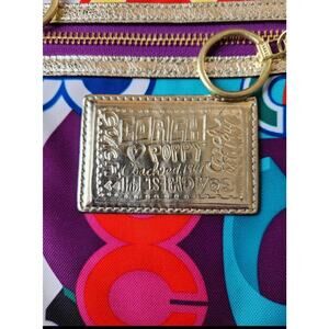 Fantastic condition vintage coach bag. The outside is very clean, the smallest marks of use, see images. Inside is blue silk material with some marks. Gold foil straps and gold zipper pulls with COACH stamped on them.