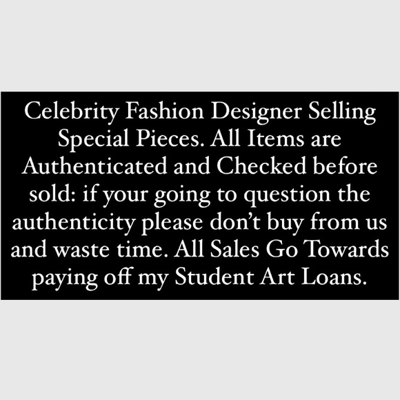 Celebrity Fashion Designer Selling Special Pieces. All Items are Authenticated and Checked before sold: if your going to question the authenticity please don’t buy from us and waste time. All Sales Go Towards paying off my Student Art Loans.