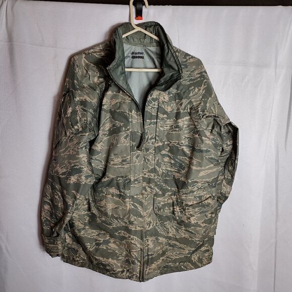 military camo rain coat with hood zippered into collar. see size range listed