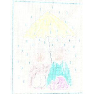 This authorized DeGrazia needlepoint canvas features a hand-painted design of two children under a yellow umbrella. Crafted by Cassandra & Tish.