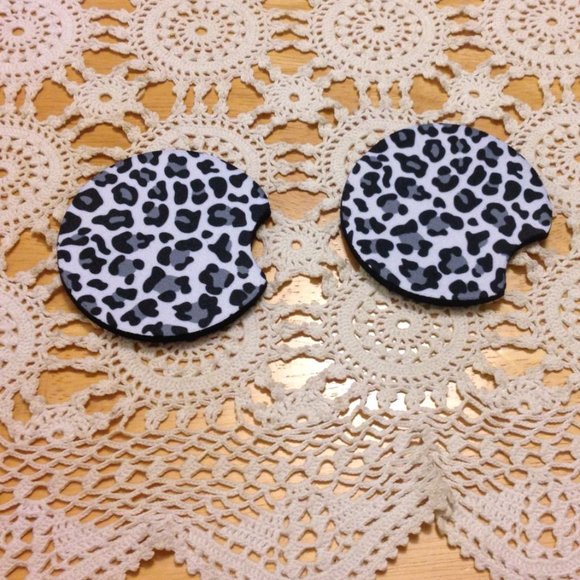 Set of two new car coasters in an animal print pattern. These go in the bottom of the beverage holders in your car. They have a cut out to make them easy to take out when needed. Please note size is 2 3/4".