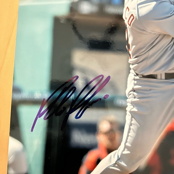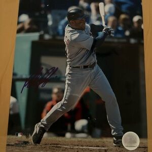 Signed baseball photo with player in white uniform. Features a bold signature in purple ink.