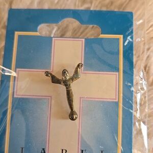 Elegant gold tone look cross lapel pin. Perfect for formal occasions. Adds a touch of faith to your attire