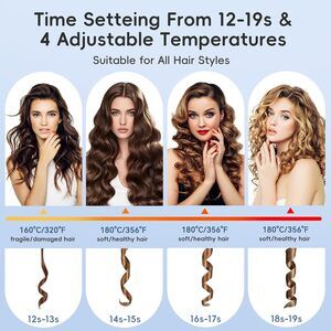 * DETAILS: 4 heat & 8 timer modes. Customize 320°F-428°F temps for fine/coarse hair. Choose 12-19s timers to craft beach waves, spiral curls or tight ringlets.