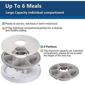 Automatic cat feeder has 6 food compartments will serve up to 6 meals a day. Set feeding times in 1-hour and 1-minute increments.The food tray and the base are linked by three horizontal snaps. Rotating the food tray clockwise can catch 2 parts, and rotating counterclockwise can separate 2 parts.