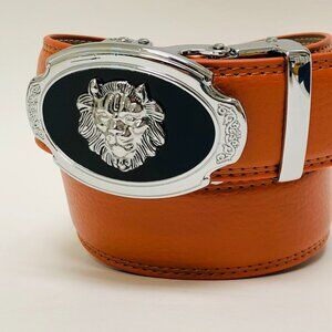Automatic Silver Lion Designer Buckle Men's Orange Ratchet Genuine Leather Belt