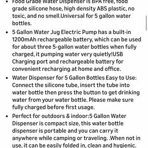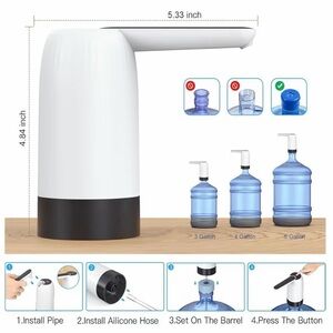 Rechargeable Water Jug Pump Dispenser. Brand new, box only opened for photo. Works with all large water jug sizes. Rechargeable via usb. Quiet operation.