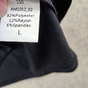 This black short-sleeve crewneck tee from Automet combines style and comfort. Designed with a flattering silhouette and versatile black tone, it is made from a soft and stretchy fabric blend containing polyester, rayon, and spandex for ultimate comfort and durability. With a size L fit, the lightweight fabric is perfect for everyday wear, offering breathability and a clean, polished look. It is machine washable and easy to maintain, providing practicality in addition to style. The subtle stretch allows for ease of movement, while the modern crewneck design keeps the look timeless and appropriate for various occasions. Whether paired with casual wear or layered for a more polished outfit, this classic black tee is an essential addition to any wardrobe. Measurements confirm a width of approximately 19 inches across and a length of about 27–28 inches, ensuring a great fit for a large size range.