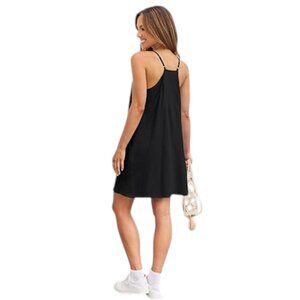 Simple black mini dress with spaghetti straps and a relaxed fit, possibly over shorts. Great for beach cover, travel, or casual evenings. Versatile essential!