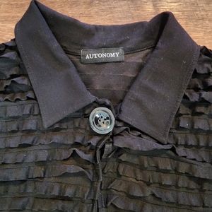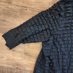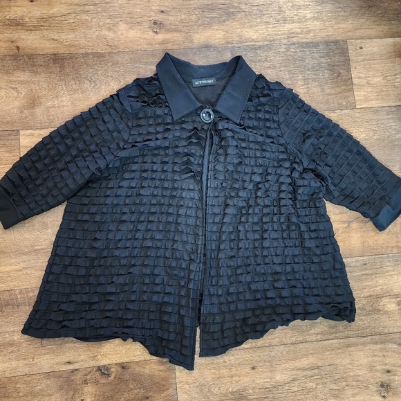 This lovely black ruffled jacket is lightweight and almost sheer except for the layers of ruffles. It has a collar and one large button at the neck. It is wonderful to wear over dresses or blouses when you need an extra layer. Sleeves are 3/4 length.