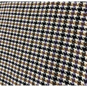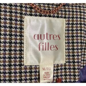 Augers Filles brand designer womens houndstooth print blazer. Blended material, please view images for exact breakdown. Dry clean only. Colors are brown & cream base with purple and black accents. Silver tone crest button. Padded, slightly ruched shoulders. Interior is a shiny striped purple. US size XL, please verify your measurements below.