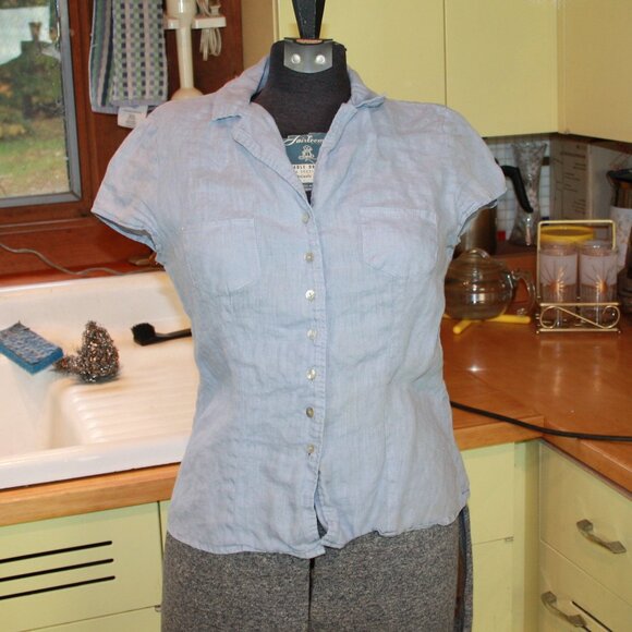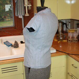 This is dress shirt by ( I believe) Autreton. It is a super short sleeve one. The buttons I think are real shells. It is marked as size 38 (US 8) and it is about 20 inches long and 18 inches pit to pit. It is wrinkly but otherwise it is in nice shape.