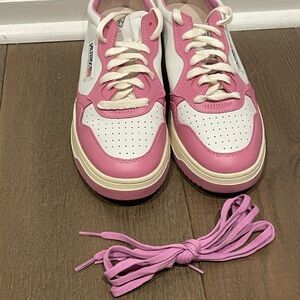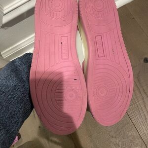 These sneakers boast a retro design with a pink and white color scheme, featuring a low-top silhouette and traditional lacing system. The pink dominates the side panels, toe box, and outsole, while the white accents the upper mesh and midsole, offering a stylish contrast. With a chunky, comfortable build, these shoes are perfect for adding a vintage touch to your casual look.