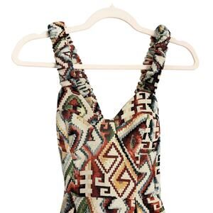 The Autumn Adeigbo Keava Mini Dress delivers a modern twist on traditional patternwork. Crafted in a bold mixed-pattern tribal jacquard, this open-back bustier style features elasticized crisscross straps, a short full skirt, and side seam pockets. Ethically made in NYC by female-owned production facilities, this limited-edition design captures artistry and individuality.