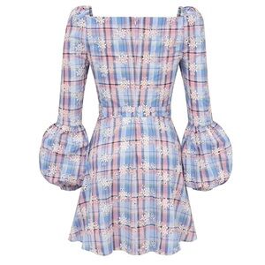 Autumn Adeigbo Catira Check Eyelet Puff-Sleeve Mini Dress in Blue Eyelet Print Our Catira dress is off-the-grid in plaid cotton finished with eyelet embroidery. Detailed with a shirred square neckline and mini A-line skirt, this bustier style features slim sleeves that flare to balloon cuffs and side seam pockets.
