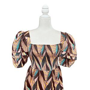 The Autumn Adeigbo Della Midi Dress combines artisanal design with modern femininity. Featuring an African-inspired leaf print, smocked bodice, and puff sleeves, this effortlessly chic silhouette flatters with a square neckline and tiered skirt. Crafted in breathable cotton with pockets for everyday wearability.