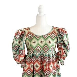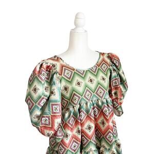 The Autumn Adeigbo Oona Mini Dress is a statement in bold femininity. Crafted from a vibrant diamond-pattern jacquard, this babydoll silhouette features an empire waist, tiered skirt, ruffled hem, and puff sleeves. Designed for effortless elegance with side seam pockets and structured texture.