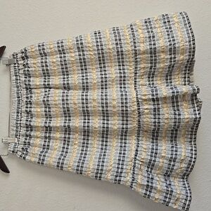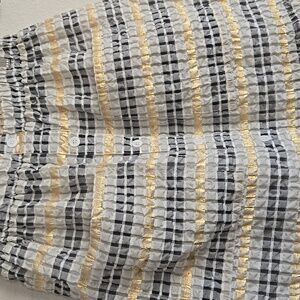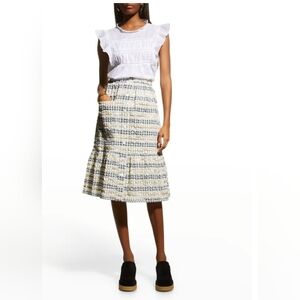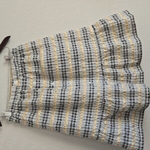 Autumn Adeigbo "June" check printed crinkle a-line skirt with flounce hem Elastic waistband Hem hits around the knee Button decor Polyester/cotton Dry clean Made in USA