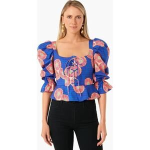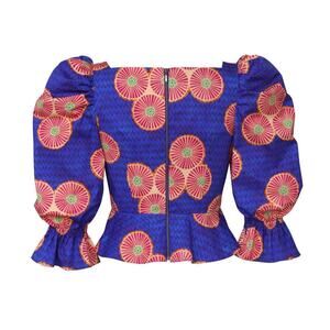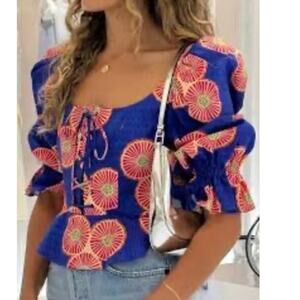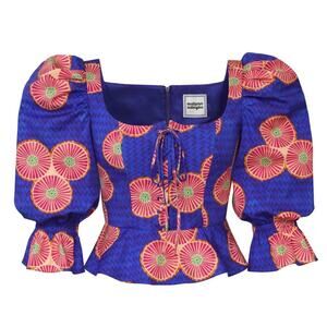 Autumn Adeigbo Mallory Top African Block Print Lace Up Peplum Blue Gold NWT 2