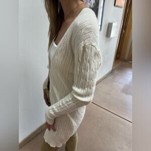 Luxurious and timeless, this Autumn Cashmere cardigan is crafted from 100% pure cashmere in a soft ivory hue. Features a classic cable knit pattern, button front, and a flattering longline fit. Perfect for layering in cooler months.
