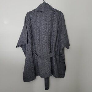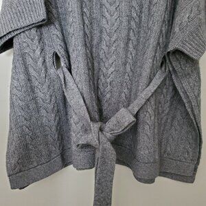 This relaxed, poncho-style sweater features a cowl neck, a belt, and short, wide-cut sleeves.
