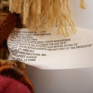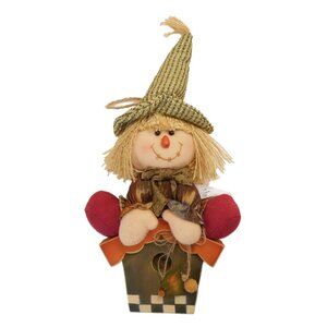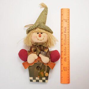 Features: Wall hanging of scarecrow / witch plush sitting on a wood birdhouse (not a functional bird house)