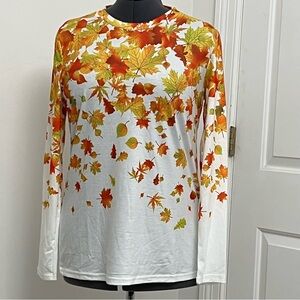 Embrace the season with this stylish autumn leaf print top. Perfect for casual outings, this top features vibrant orange and green leaves on a white background. A must-have for your fall wardrobe.
