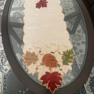 Enhance your dining experience with this elegant autumn leaf table runner. Featuring a blend of cream, brown, and green leaves, it adds a touch of nature to your home decor.