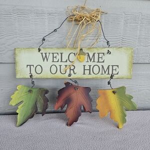 Autumn Leaves Hanging Welcome to Our Home Wooden Decor Sign Plaque Fall. There is one small knick to the middle leaf at the top corner, as shown, could be touched up with some paint. Otherwise, it is in good, pre-owned condition. Made of wood. Measures 12 inches long and 8 1/4 inches long. The hanger measures 3 1/2 inches from the middle loop to the top of the sign. The leaves will be folded under for shipping. Upon arrival, simply unfold them, and you will be good to go. Smoke-free.